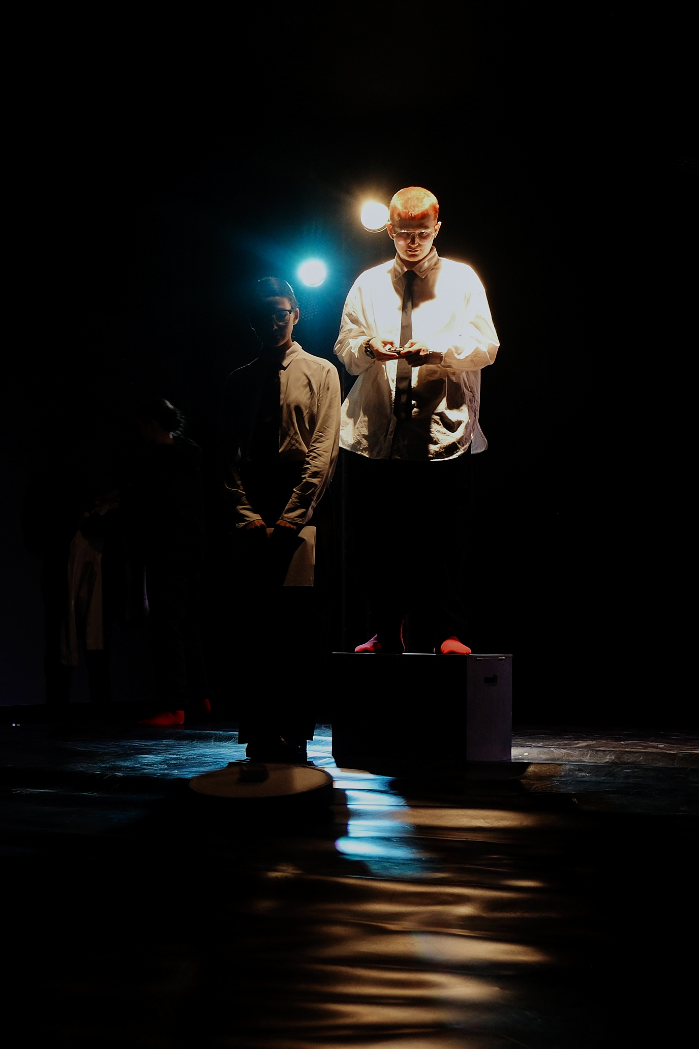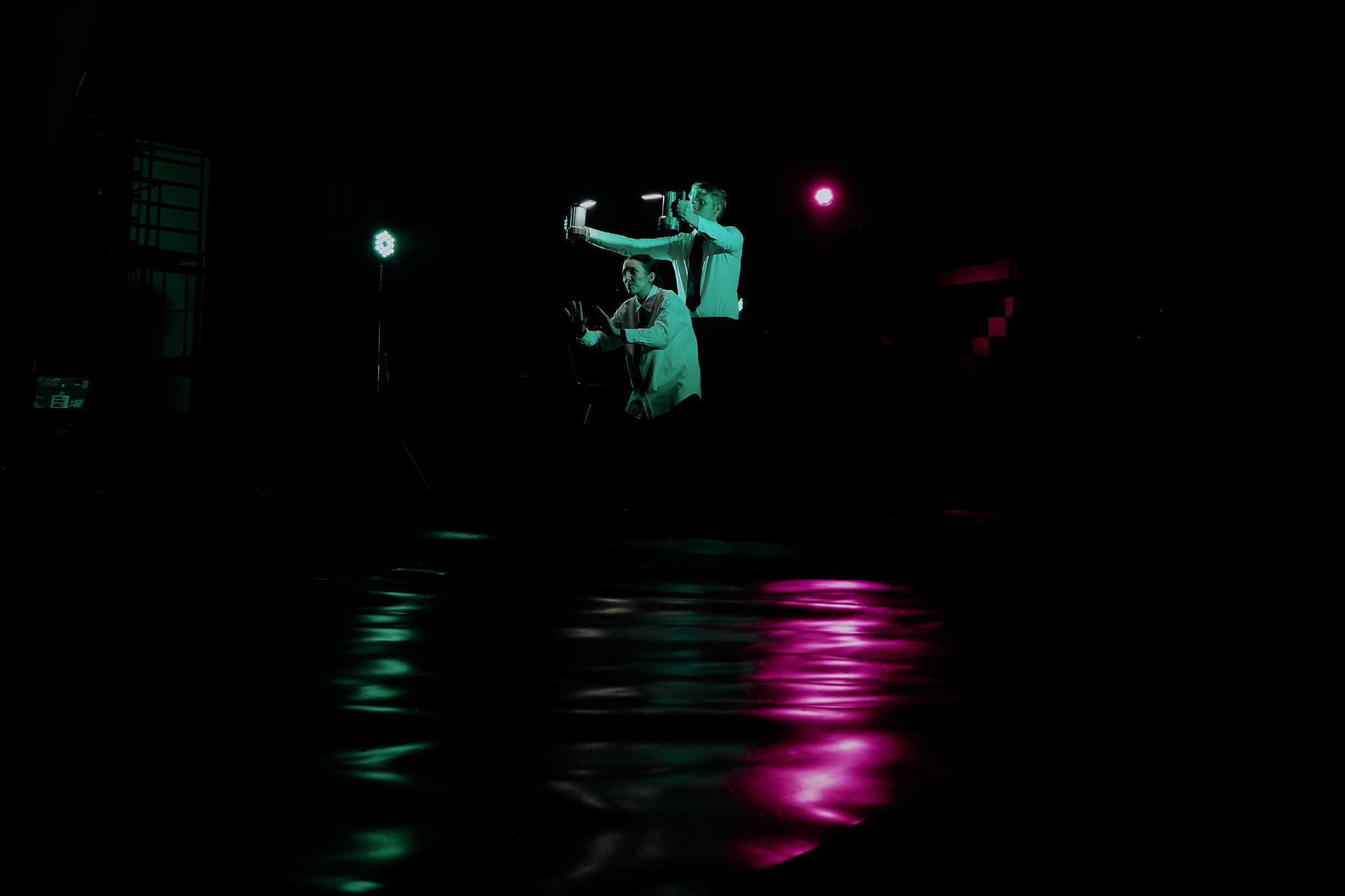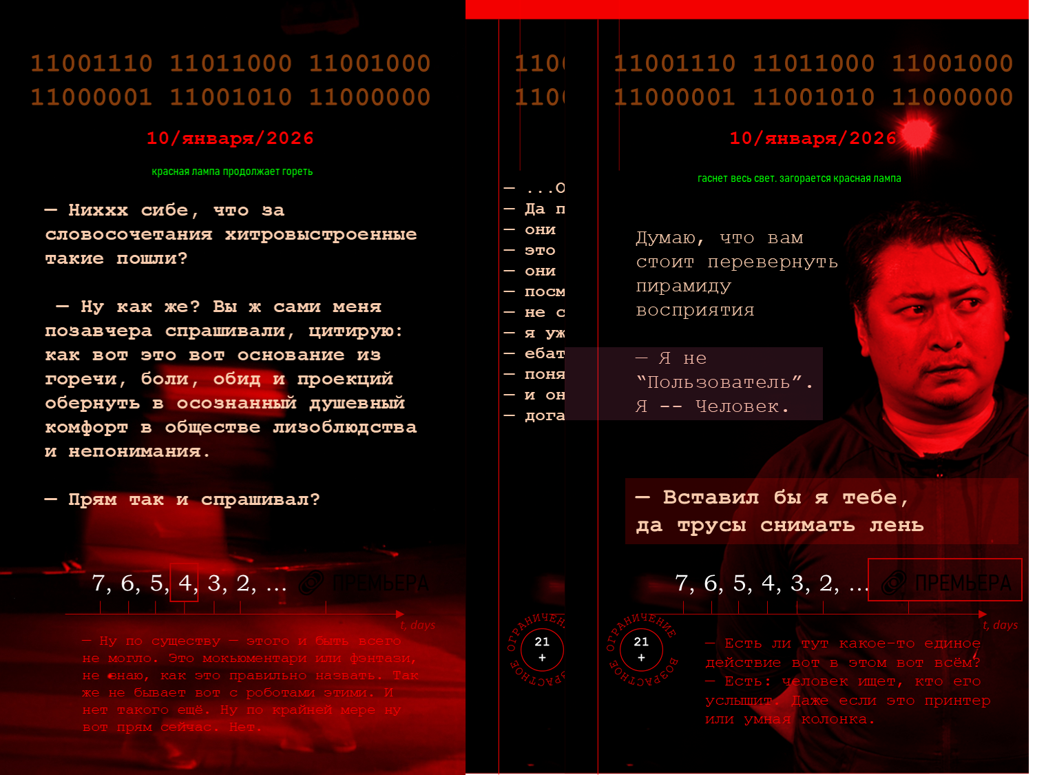 Во время спектакля пространство будет балансировать между бытовой сценой и метафизическим триллером: здесь будут слышны шумы алгоритмов, языковые сбои и тревожная тишина, в которой каждый зритель, при желании может услышать себя.