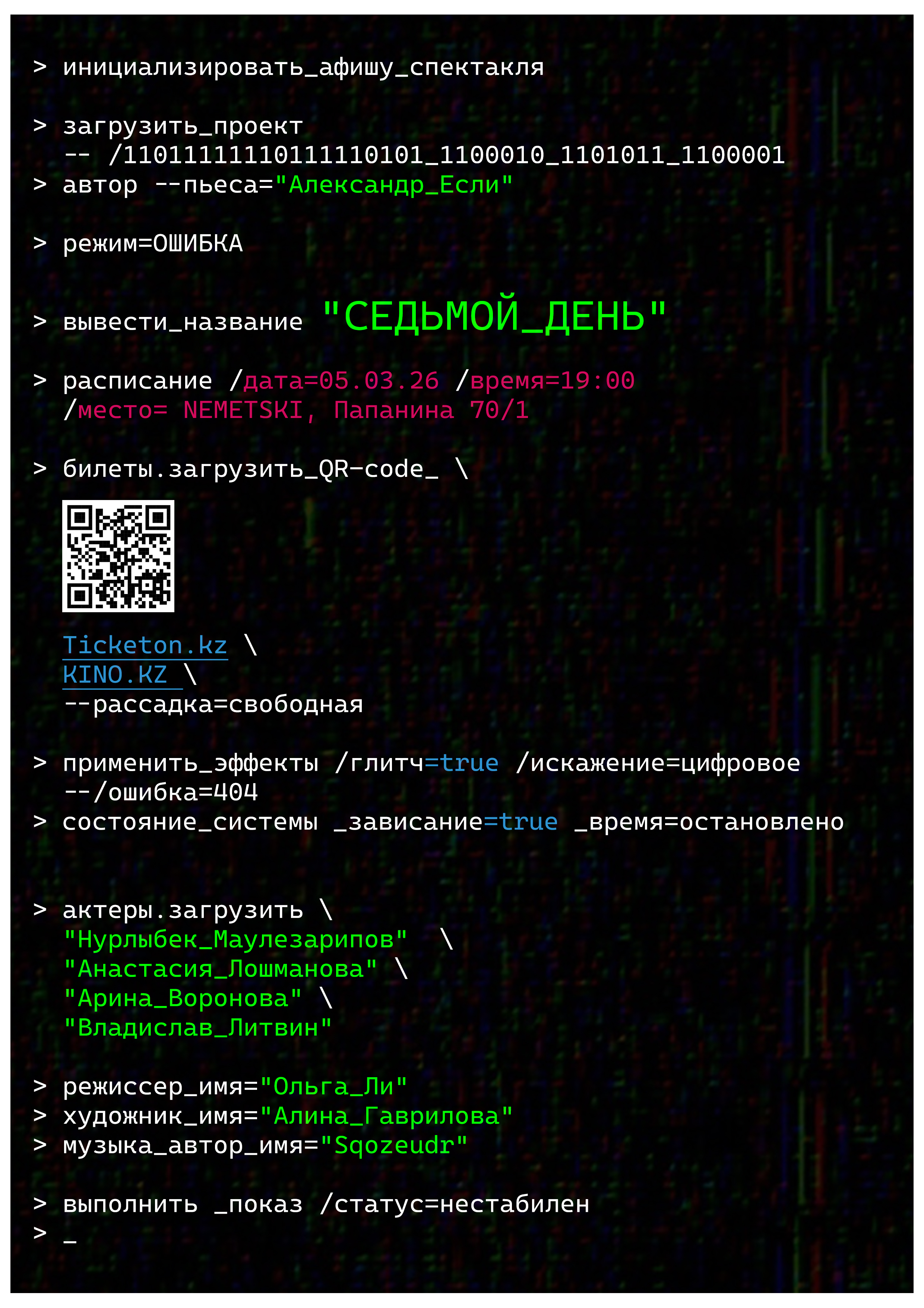 Пьесу написал казахстанский драматург Александр Если. Оригинальное название «11001110 11011000 11001000 11000001 11001010 11000000», которое читается как «Ошибка».